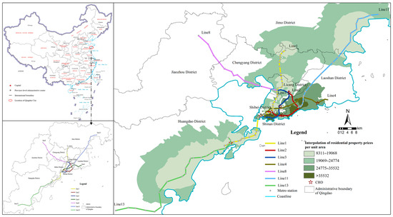 The four stations of Qingdao Metro Line 2, namely Haiyou Road, Haichuan Road, Hai’an Road, and Shilaoren Beach Bathing Ground are surrounded by residential areas that have been affected by the combined effect of location value (Figure 5). Among them, the stations of Haiyou Road, Haichuan Road, and Hai’an Road are located in Laoshan District. The residential transaction data of this district shows that 72% of the properties priced above CNY 8 million are concentrated within a 1 km radius of the metro stations. The opening of urban rail transit has transformed the traditional coastal value into a dual location model of “sea view + rail transit”, which attracts high-income groups and tourists and reflects the housing appreciation effect of rail transit. The rail transit networked operation near Shilaoren Beach Bathing Ground Station has restructured the spatial accessibility. It not only alleviates the traffic congestion problem during the peak tourist season but also drives the economic development of the surrounding areas, thereby enhancing the overall image and competitiveness of the city. In addition, the innovative policy of land value recovery based on the land development strategy of rail transit-oriented development compensates for the funding gap of rail construction, further promoting the sustainable development of urban rail transit, and thereby significantly influencing and having a positive impact on the housing prices of this area in Qingdao.