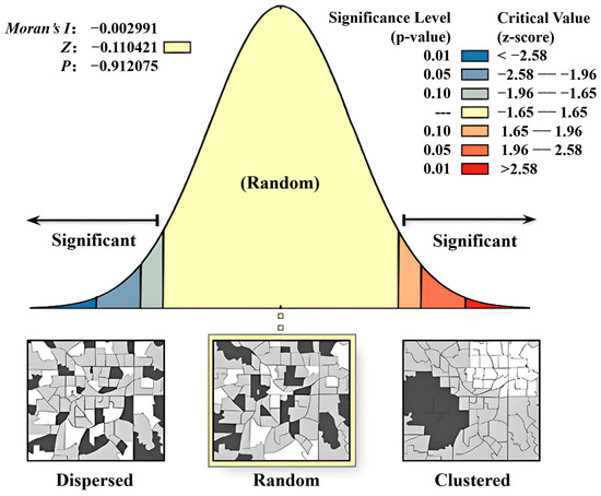 A spatial autocorrelation analysis was conducted to explore the interrelationships among various types of residential spaces based on housing price data and the spatial locations of residential areas. It included both global spatial autocorrelation and local spatial autocorrelation. The Moran’s I Index is commonly used to measure this, with Moran’s I > 0 indicating a positive correlation, suggesting that the residential spaces are aggregated; conversely, Moran’s I < 0 indicates a negative correlation, suggesting that the residential spaces are dispersed; and Moran’s I = 0 indicates no correlation, suggesting that the residential spaces are randomly distributed. Among them, global spatial autocorrelation was used to determine the overall degree of correlation and dependence of housing prices, with a larger value indicating greater spatial correlation. The calculation formula is as follows: