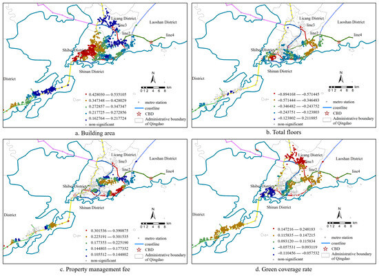 The MGWR method was used to calculate the estimated coefficients and specific bandwidths for 12,924 sample data from 1260 residential communities around Qingdao Metro (Table 5). The significance test results of the model showed that the building area (99.13%), total floors (40%), green coverage rate (61.59%), property management fee (41.27%), distance metro (16.11%), hospital (37.14%), and park (9.44%) were significant variables. These eight variables demonstrated spatial heterogeneity and local significance. The results of the GWR model indicated that the optimal bandwidth was 99. Compared with the unique bandwidths of OLS and GWR, the MGWR model used in this study had an exclusive bandwidth for each housing price influencing variable, with a variation range of [44, 373]. The influence of the selected factors on housing prices exhibited spatial heterogeneity, and the scale of this heterogeneity varied. Variables with larger bandwidths could have an impact on housing prices over a wide range or even globally, while variables with smaller bandwidths were mainly confined to smaller or local areas. Among them, the bandwidth values of total building floors and the distance to the nearest hospital were within 100, indicating that the spatial heterogeneity of these two influencing factors was relatively strong, suggesting that the influence of this variable was highly localized [51,52]. The bandwidth values of other influencing factors ranged from [142, 373], and the spatial heterogeneity degree was at an intermediate level, exerting a moderate influence on housing prices.