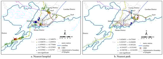 Among the neighborhood characteristic factors, the research found that the distance factor of the nearest tertiary hospital had a relatively strong impact on residential prices only within 44 m (Figure 4). The regression coefficients were all negative. The housing prices indicated that the closer the housing was to the tertiary hospital, the greater the increment effect on the housing prices. The interchange stations of Metro Line 1 and Line 13 and the areas along Metro Line 2 passing through Shinan District and the western part of Laoshan Mountain had relatively significant effects. The increasing attention paid by residents to health quality made medical resources an important consideration factor when purchasing houses. The medical convenience of the tertiary hospitals was more attractive to residents to purchase surrounding housing, indirectly leading to an increase in housing prices. The distance of the nearest park was positively or negatively correlated with the housing prices, and the spatial scale affected a radius of 349 m. Houses located closer to the park are more likely to attract home buyers. However, while parks provide a peaceful environment for residents, they also bring about negative impacts. Because houses close to the park are disturbed by the noise from activities within the park, there is a phenomenon in some areas where the number of parks is positively correlated with house prices.