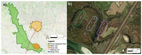 The study area is located near the Moriano oxbow lake, within the Ticino Valley Regional Park, near Bereguardo (PV). The Moriano oxbow lake is a meandering wetland formed by the natural evolution of the Ticino River. Although partially isolated from the current river flow, it remains hydrologically and ecologically connected to the surrounding river system. Oxbow lakes such as Moriano are important for the conservation of biodiversity as they provide refuges for aquatic and semi-aquatic species and contribute to the ecological complexity of riverine landscapes. The area is set in the north-western Pavia province, along the left bank of the Ticino River, at the end of the Naviglio canal of Bereguardo (Figure 1a). This region covers a surface area of approximately 39 hectares and includes a significant portion of the floodplain, as well as the Ticino valley depression and the adjacent low plain. The main anthropogenic element influencing the area is the A7 highway (Figure 1a, in red), known as the “Autostrada dei Giovi”, which is one of the principal arterial roads connecting two main urban centers: Milan to Genoa. This infrastructure has a significant impact both acoustically and ecologically, contributing to noise pollution and fragmentation of the natural habitat [8].