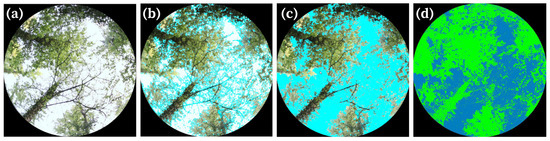 Image processing procedure: (a) The original image is imported into the analysis software; (b) automatic classification starts, where the pixels are separated into “sky” (in blue) and “vegetation”; (c) the classification is manually refined, correcting the wrongly classified pixels and converting them back to “sky”; (d) improving the distinction between sky and vegetation, increasing contrast and saturation for better visualization, iterating the previous steps.