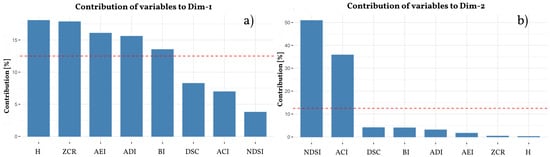 The analysis focused on the average values of ecoacoustic indices calculated for each site during the period one hour before and two hours after sunrise, when birdlife is particularly active. Subsequently, graphs were generated in R to visualize which ecoacoustic indices contribute most to the first two principal components (PC1 and PC2). These graphs provide a visual representation of the distribution of the variables and show which indices have the greatest influence in explaining the total variance of the dataset. To visually identify which variables contribute most to each of the principal components, the function “fviz_contrib” from the “factoextra” package in R was used [32]. This function creates a bar graph representing the contribution of each variable to the selected components. A dashed reference line is drawn on the graph, indicating the expected contribution in the case of a uniform distribution of the variables. Columns above this line represent variables with an above-average contribution, suggesting that they have a particularly strong influence on determining the first dimensions of the PCA. This approach allows us to focus on the most significant ecoacoustic indices to explain the principal components, facilitating a clearer understanding of the sound dynamics of the studied area.