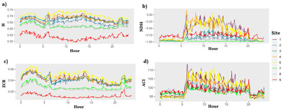A temporal descriptive analysis was performed on the average values of ecoacoustic indices for each site. Boxplots of the average indices for different time frames (diurnal/nocturnal) were created to refine the analysis and facilitate comparisons between the conditions.