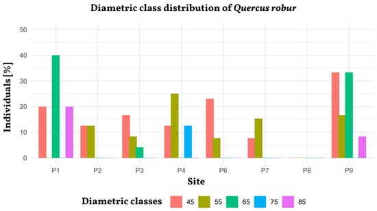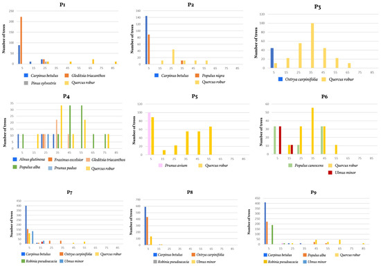 To describe the forest structure in a general way, the surveyed tree species were divided into different diametric classes based on DBH. Nine diametric classes were defined, with intervals of 10 cm each. For each survey plot, the total number of individuals per diametric class and species was counted [40]. These values were subsequently converted to a hectare basis to standardize the data.