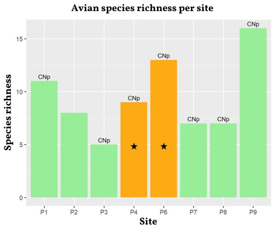 To assess the relationship between tree size and avian richness, vegetation variables were analyzed, focusing on the ecological role of large trees. These provide nesting sites and food resources for birds, particularly arthropods found in bark, woody tissues, and epiphytic layers on higher branches [45]. The analysis included both primary cavity nesters, such as woodpeckers, which create their own cavities, and secondary cavity nesters, such as titmice and creepers, which utilize existing cavities [46]. Habitat preferences were considered, with primary nesters favoring mature forests and woodpeckers adapting to fragmented landscapes, to account for variations in forest structure and maturity.