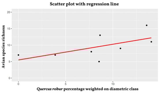 Subsequently, the correlation between bird species richness (obtained via BirdNET) and the percentage of individuals of the dominant tree species per diameter class was calculated. Correlation analysis was performed using Spearman’s correlation coefficient due to the non-parametric distribution of the data. All statistical analyses were carried out in the R environment, using the stats package [49].