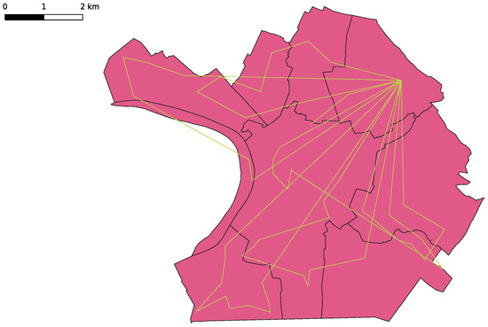 Figure 3 illustrates an example of a signal-based collection route. The dots represent container locations connected via optimized routes. CO2 emissions are computed based on travel distance, using the emission factor specified in Section 2.