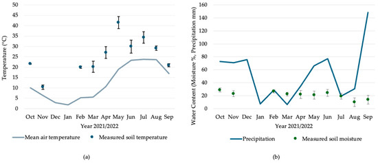 The average air temperature for the growing season 2021/2022 was 12.4 °C. The mean air temperature during the growing season and the observed soil temperature during the months (n = 1) when Rs was measured (n = 3) is shown in Figure 2a. A general seasonal fluctuation in mean air temperature was observed. Measurements of CO2 flux over the experimental period had a range of soil temperature (8.9–45.9 °C) at a depth of 10 cm. The lowest mean air temperature was measured in January and the highest in July. The highest mean soil temperature (41.5 °C) was recorded in May and the lowest mean soil temperature (10.4 °C) was observed in November, when measurements were not made in December and January due to freezing soil conditions. At each observation date when soil temperature was measured, the mean observed soil temperature was higher than the monthly air temperature. This seems unusual at first since soil is known as a better insulator of temperature, but the soil temperature was only measured during one day in each month and within daylight hours. It is important to note that the soil temperature follows the same trend of seasonal variation but that the soil temperature at the time of data collection with other variables was higher than the average air temperature for the month to contextualize the data that will be discussed. In February, March, April, and May, differences in observed soil temperature were much higher (>15 °C) than the mean air temperature during those months. Due to the single observation per month, the observed soil temperature does not represent the actual temperature changes in the vegetative season.