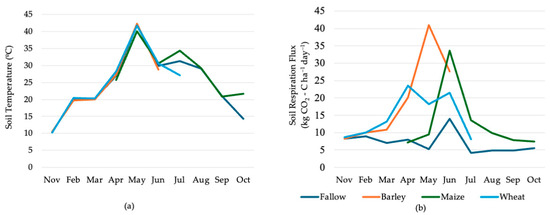 Monthly variation in soil temperature (a) and measured Rs (b). Values on the y-axis represent mean observed values taken in 3 replications of each crop once a day in each month.
