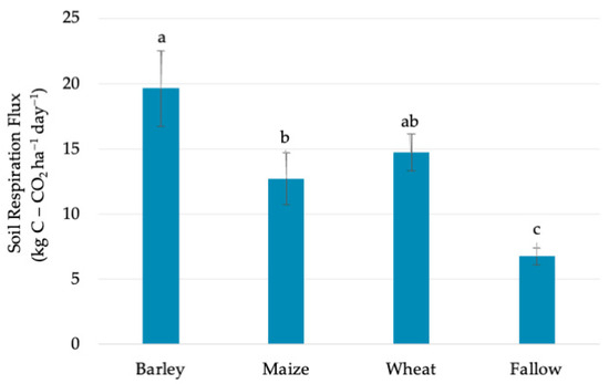 Average Rs fluxes of the vegetation season varied significantly among different crops (Figure 4). The mean flux of Rs for the growing season was found to be 19.64 kg CO2-C ha−1 day−1 for barley, 12.72 kg CO2-C ha−1 day−1 for maize, 14.73 kg CO2-C ha−1 day−1 for wheat, and 6.75 kg CO2-C ha−1 day−1 in the bare soil. A significant difference in Rs was present between barley and maize and between soil with crops and with no vegetation.