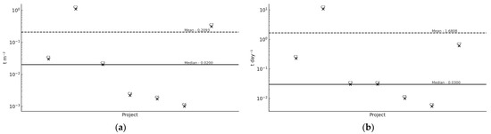 A quantitative analysis of the standardized indicators across all 16 projects reveals significant variability. The average daily CDW generation ranges from 0.0054 to 10.85 t day−1, with a group mean of 1.31 t day−1 and a median of 0.12 t day−1. For CDW generation per square meter, the values range from 0.0010 to 6.44 t m−2, with a mean of 0.69 t m−2 and a median of 0.0141 t m−2 (Figure 1 and Figure 2). These statistics highlight the dataset’s asymmetry and reinforce the divergence between the mean and the more robust median.