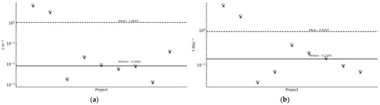 Figure 1 and Figure 2 display the distribution of both indicators across construction and rehabilitation projects, respectively. Each data point corresponds to a value listed in Table 3. The dashed and solid lines represent the group-specific mean and median, respectively, enabling direct visual comparison between these estimators.
