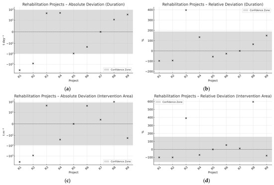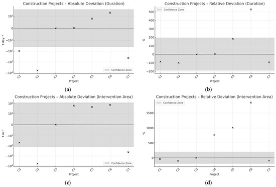 Figure 3 and Figure 4 depict the deviation profiles for construction and rehabilitation projects, respectively, across four key dimensions: absolute and relative deviations in CDW generation per day (panels a and b) and per intervention area (panels c and d). The gray-shaded areas in each panel correspond to the statistical confidence bounds, calculated using the Median ± 2×MAD rule, with threshold values being summarized in Table 5.