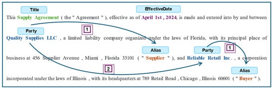 Over the years, extensive research has been conducted on entity and relation extraction, both in generic contexts [8,9] and in domain-specific scenarios [10,11,12]. Most of this research has focused on extracting relationships between two entities presented within individual sentences [13,14]. However, in legal contract texts, relation extraction is more complex, as entities and their relationships are often distributed across multiple sentences or clauses, requiring advanced contextual understanding and document-level reasoning [15,16]. Furthermore, a single sentence may contain more than two entities and multiple relationships, making sentence-based approaches inefficient.