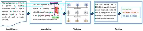 Our process began with a set of preprocessed and annotated contractual clauses, where named entities and their mentions had already been identified, and our aim was to efficiently model the relationships between these entities. The input to our model consisted of these annotated clauses, ensuring that our dataset remained structured while preserving its semantic richness. The overall process flow is shown in Figure 5, illustrating the key stages of relation extraction and demonstrating the transformation from raw contractual text to structured relationship extraction using a hierarchical transformer model.