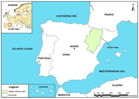 We chose the Autonomous Community of Aragón in NE Spain, covering 47,720 km2, as the study area (Figure 1). This region was selected for three main reasons as follows: (i) it has a very high proportion of land devoted to agriculture (around half its surface), (ii) nearly 25% of cropland is irrigated, and (iii) it is highly representative of the Mediterranean climate and cereal cropping systems. The climate is predominantly Mediterranean continental, with average annual temperatures and precipitation for the three main cities of 15.5 °C and 322 mm for Zaragoza, 12.2 °C and 378 mm for Teruel, and 14.0 °C and 480 mm for Huesca, respectively [45].