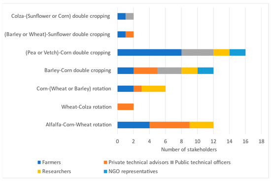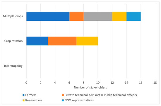 Preferred type of diversification by cropping system (number of stakeholders choosing each type of diversification as the most adequate one). Own elaboration.
