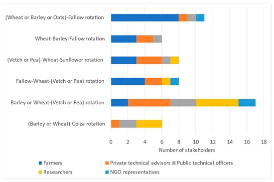 Last, Figure 4 and Figure 5 also show the crop combinations selected by each stakeholder type. In rainfed production, a statistically significant relationship exists between the type of stakeholder and crop rotation choice, should a p < 0.01 threshold be assumed for rejecting the null hypothesis of independence among variables in the Fisher’s test. For example, farmers show a preference for the cereal–fallow rotation, while other stakeholders mostly prefer the two-years winter cereals–legume rotation (Figure 4). In fact, more farmers prefer the three-year wheat–legumes–fallow rotation than the two-years winter cereals–legume rotation. Crop rotations with fallowing were significantly more selected by farmers than by other stakeholders. Although empirical evidence shows limited effectiveness of long-bare fallowing in in NE Spain rainfed systems [22], farmers are still inclined to its use, likely due to past policy incentives. Cropland set-aside was encouraged by EU Common Agriculture Policy between 1988 and 2008. Although legume cropping or forestry alternatives were allowed, fallowing was the predominant use for set-aside area, and farmers became familiar with its use as a rotation alternative. In irrigated cereals, Fisher’s exact probability (p = 0.433) allows to accept the null hypothesis of independence among variables, indicating no statistically significant differences between stakeholder types in the choice of crop combinations, neither for crop rotation nor for double cropping (Figure 5).