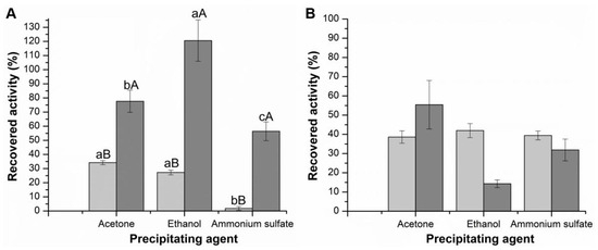 In summary, it can be stated that the precipitating agent ammonium sulfate presented lower recovered activity and was therefore discarded for subsequent experiments.