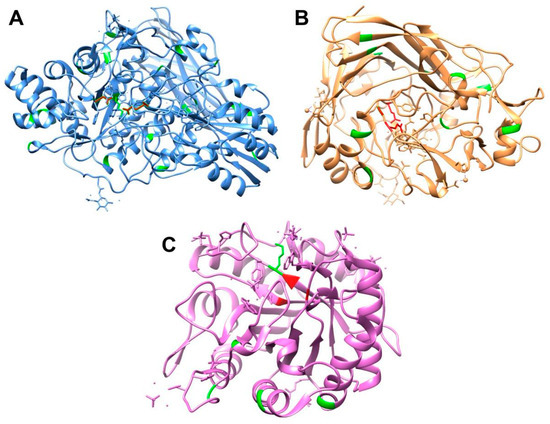 Structure of β-glucosidases (Cel3A, (A)), exoglucanase (Cel7A, (B)) and endoglucanase (Cel5A, (C)). Lysine residues are in green and active site residues in red. PDB codification: (A)—3ZYZ; (B)—1DY4; and (C)—3QR3.