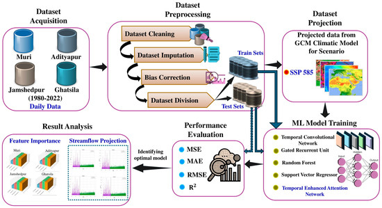 This study bridges the identified research gap by comprehensively comparing multiple ML techniques for bias correction in CMIP6-driven hydrological forecasting in the Subarnarekha River Basin. Specifically, this study evaluates the performance of a TCN, GRU, RF, and SVR alongside the proposed TeaNet model. Recent research [42] analyzed RF, LSTM, SVM, and multivariate adaptive regression splines (MARS) for streamflow prediction in the rivers of Southern India, demonstrating that RF outperformed other models in daily streamflow prediction, while LSTM showed superior performance for monthly streamflow forecasting. These findings validate the inclusion of RF and LSTM in our study while emphasizing the need for novel architectures like TeaNet to address model limitations in extreme flow prediction. Similarly, a study [43] applied AI-driven forecasting techniques, including RF, ANNs, and hybrid models, to predict river discharge in the Himalayan Sindh River. Their findings highlighted the superior performance of hybrid models like RF-SARIMA in improving discharge predictions by effectively capturing seasonal variations and complex hydrological dynamics. These results reinforce the need for comparative assessments of advanced ML architectures to improve the forecasting accuracy under future climate scenarios further. To extend the applicability of these ML approaches, this study integrates shared socioeconomic pathway SSP585 to analyze future hydrological scenarios, providing a further understanding of climate-driven water resource variability. By comparing various ML approaches, this study presents an integrated framework for the selection of the optimal bias correction method, thereby enhancing hydrological projections, water resource planning and sustainability, and climate resilience in underrepresented river basins.