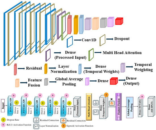 The model begins with an input layer that accepts data shaped as (T, F), where T—number of time steps and F—number of features in the sequence. Temporal feature extraction is achieved using five convolutional layers, each with causal padding and increasing dilation rates (1, 2, 4, 8, 16). The causal padding ensures that future data points are not used to predict past values, maintaining temporal causality. The dilation rates expand the receptive field, allowing the model to capture dependencies across varying time scales efficiently. Formally, the output of a dilated convolution at time t is expressed as follows (Equation (13)):