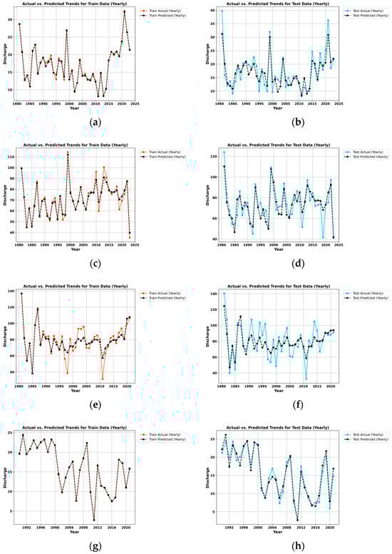 Actual vs. forecasted river discharge using the TeaNet model for both the training and testing datasets. Adityapur, (a,b) Ghatsila, (c,d) Jamshedpur, (e,f) Muri (g,h).