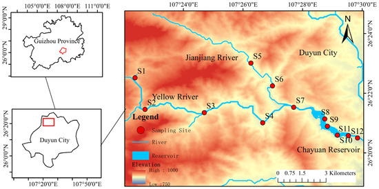 The study was conducted in the Chayuan watershed, located in Duyun City, southern China, a region representative of subtropical karst terrain. This area is characterized by limestone-dominated geology, well-developed surface depression–doline systems, and a dual hydrological structure featuring seasonal sinking streams connected to subterranean conduits. The watershed includes the main Chayuan reservoir and its two epigenetic tributaries, the Yellow River and the Jianjiang River (Figure 1). As a typical subtropical karst basin, it exhibits the defining features outlined by the International Research Center on Karst, including shallow residual soils, moderate rocky desertification, and pronounced hydrological connectivity between surface and underground systems. The reservoir has a total storage capacity of 19.6 million m3. It serves as the sole source of drinking water for 300,000 urban residents. The watershed is characterized by a humid climate, with a mean annual precipitation of 1350 mm and a runoff depth of 740 mm (54.8% of precipitation), which yielded an average annual discharge of 105 million m3. The minimum recorded flow was 0.36 m3/s, highlighting seasonal water scarcity. Under normal water-storage conditions, the reservoir extends approximately 4.5 km upstream, with an average depth of 10 m and a maximum depth of 21 m. The flow velocities of the Yellow River (0.13 m/s) and Jianjiang River (0.11 m/s) represent annual averages derived from continuous hydrological monitoring over a complete hydrological year, reflecting the cumulative hydrodynamic conditions that influence sediment transport and deposition processes. These rivers and the reservoir are also subject to anthropogenic impacts, including nutrient and organic pollution from agricultural runoff and domestic wastewater discharge. The surrounding watershed is characterized by mixed land use, including urban settlements, farmland, and tea plantations, all of which contribute to varying degrees of ecological pressure on the aquatic environment.