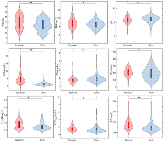 To investigate the changes in aquatic environmental variables within the Chayuan watershed, we sampled the reservoir and river regions (Figure 2 and Figure S1). The research found that the WT ranges of the reservoir and the river areas were 9.1~30.2 °C and 6.9~26.3 °C, respectively. The DO ranges were 4.1~14.1 mg/L and 5.1~13.4 mg/L, respectively. The pH ranges were 6.73~9.12 and 6.44~10.01, respectively. The Chl a value ranges were 0.658~13.237 mg/L and 0.01~6.88 mg/L, respectively. The TN value ranges were 0.18~2.75 mg/L and 0.038~3.369 mg/L, respectively. The EC value ranges were 49~318 μS/cm and 34~459 μS/cm, respectively. The NH3–N value ranges were 0.002~0.468 mg/L and 0.002~0.739 mg/L, respectively. The CODMn value ranges were 0.67~3.32 mg/L and 0.49~6.52 mg/L, respectively. The TP value ranges were 0.003~0.055 mg/L and 0.001~0.027 mg/L, respectively. Compared to those for the reservoir, the values of the environmental variables for the river had wider distributions, indicating that the variability of environmental variables in river areas was greater. The median values of environmental variables in the reservoir area exceeded those in the rivers, signifying that the average levels of these factors in the reservoir were comparatively elevated. Therefore, the environmental variables of the reservoir showed relative stability, while those of the rivers showed greater dynamism and complexity. Further comparative analysis of the environmental variables in the reservoir and the rivers was conducted using the Mann–Whitney U test. The results revealed significant differences in the concentrations of pH, DO, TN, CODMn, and NH3–N between the reservoir and the rivers (n = 288, p < 0.05). Notably, extremely significant differences were observed in the concentrations of WT, Chl a, and TP (n = 288, p < 0.01). The environmental variables in the Chayuan watershed exhibited pronounced seasonal fluctuations, particularly for WT, DO, Chl a, NH3–N, CODMn, and TP, which displayed typical characteristics of higher values in spring and summer and lower values in autumn and winter. In contrast, the annual variations in environmental variables in the reservoir were relatively moderate, demonstrating greater stability compared to the rivers. This difference is likely associated with the longer water-retention time in the reservoir.