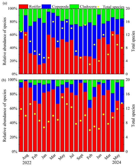 Relative abundance and number of zooplankton species in the Chayuan watershed. (a) reservoir; (b) rivers.