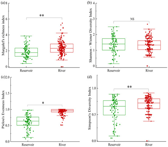 Diversity of zooplankton communities in the Chayuan watershed. (a) Margalef’s Richness index; (b) Shannon–Wiener diversity index; (c) Pielou’s evenness index; (d) Simpson’s diversity index. “*”, significant difference; “**”, highly significant difference; “NS”, no significant difference.