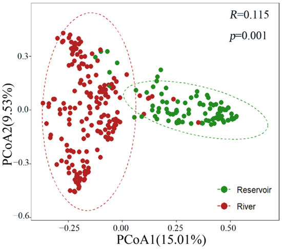 The α-diversity of zooplankton in the Chayuan watershed was evaluated using four parameters, namely Margalef’s Richness index, Pielou’s evenness index, Shannon–Wiener diversity index, and Simpson’s diversity index (Figure 4). In terms of the Margalef richness index, the values of the reservoir ranged from 0.5~3.9 and those of the river areas ranged from 0.1~5.9. Regarding the Shannon–Wiener diversity index, the values of the reservoir ranged from 0.2~2.6 and those of the river areas ranged from 0.1~2.7. For the Pielou’s evenness index, the values of the reservoir ranged from 0.1~0.8 and those of the river areas ranged from 0.5~0.9. In the case of the Simpson’s diversity index, the values of the reservoir ranged from 0.1~0.7 and those of the river areas ranged from 0.05~0.85. The results showed that although the Shannon–Wiener diversity index showed no significant difference between the reservoir area and the rivers, the other three indices were all significantly higher in the river area than in the reservoir area (n = 288, p < 0.05). PCoA analysis was performed on zooplankton using the Bray–Curtis distance (Figure 5). The results showed that the first and second axes of the principal coordinates explained 15.01% and 9.53% of the variation, respectively. Meanwhile, the zooplankton communities in the Chayuan watershed showed significant differences between the reservoir area and the river areas (R = 0.115; p ≤ 0.001).