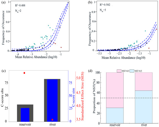 The predicted occurrence frequencies for representing zooplankton communities from the Chayuan watershed. The solid blue line is the best fit to the neutral community model (NCM), and the dashed blue line indicates 95% confidence intervals around the NCM prediction. (a) reservoir; (b) rivers. Zooplankton that occur more or less frequently than predicted by the NCM are shown in green and brown, respectively. (c) C-score metric using null models. (d) Comparison of the intra-group normalized stochasticity ratio (NST) between zooplankton communities.