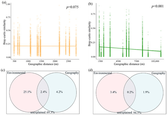 Distance–decay relationships of zooplankton community, graphed as Bray–Curtis similarity versus geographic distance across habitats in the Chayuan watershed. Solid lines represent ordinary least-squares linear regressions. (a) reservoir; (b) rivers. Variance partitioning analysis of environmental and spatial drivers of zooplankton community structure in the Chayuan watershed. (c) reservoir; (d) rivers.
