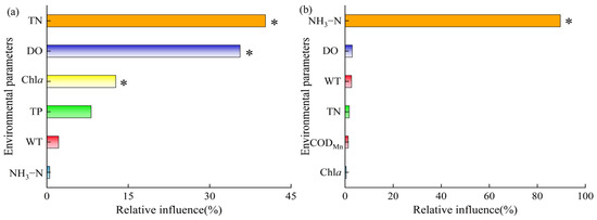Evaluation of the response of zooplankton community to environmental variables using aggregated boosted tree (ABT). (a) reservoir; (b) rivers. “*” indicates a significant contribution.
