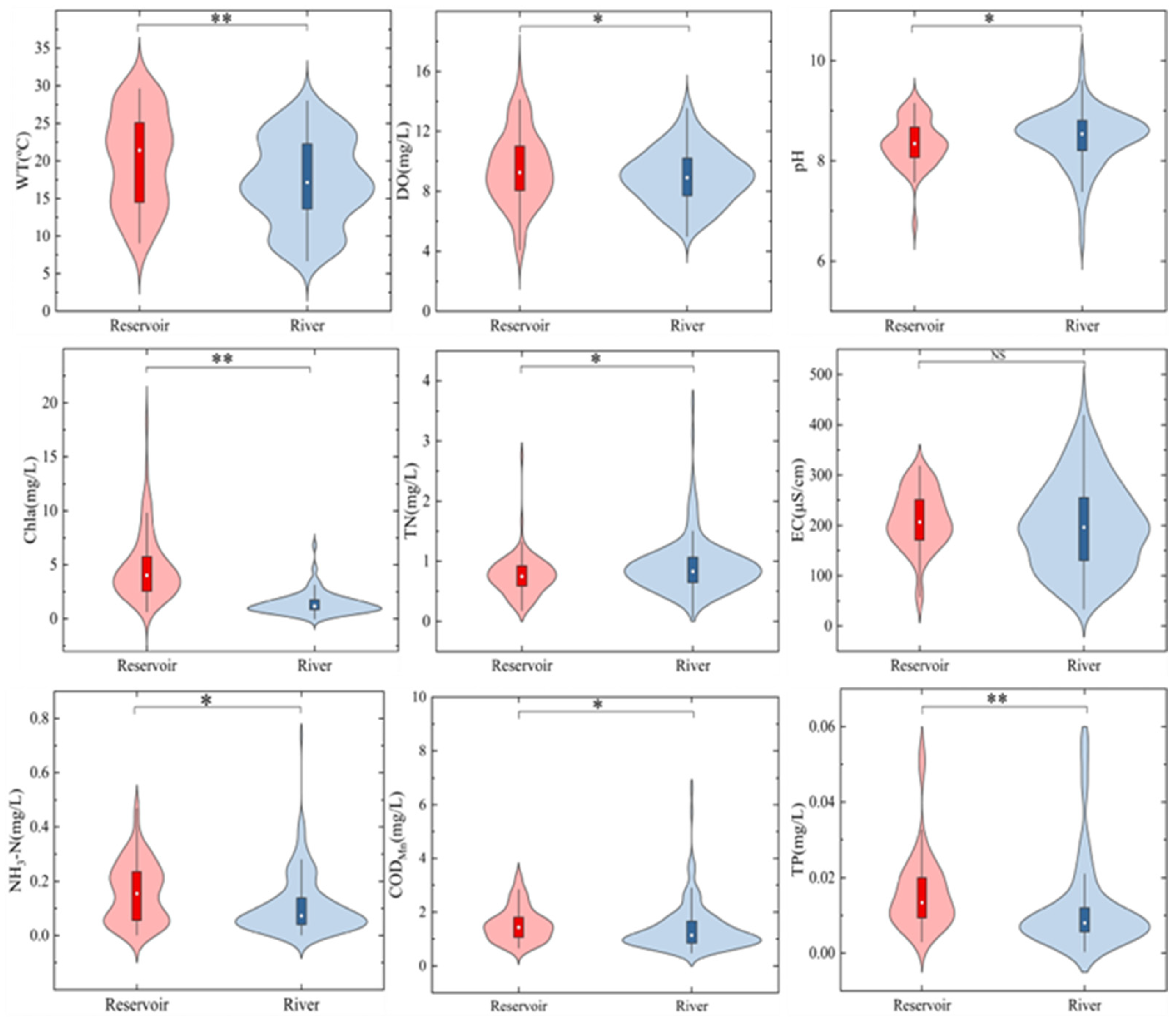 Changes in the values of environmental variables in the Chayuan watershed. The widths of violin plots reflect data concentration, while embedded box plots show median and interquartile ranges. “*”, significant difference; “**”, highly significant difference; “NS”, no significant difference.