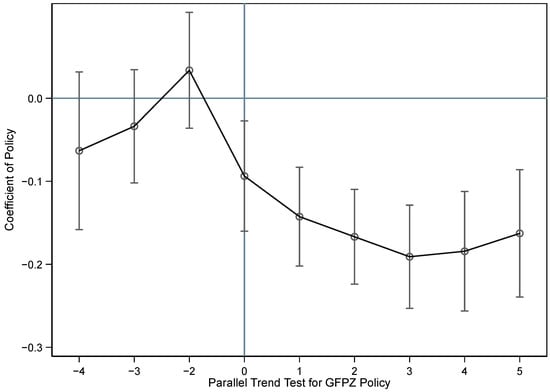 Furthermore, to control for firms’ internal environmental commitment and capabilities, we included the firm-level Green Governance Performance (GGP) variable. This index captures the quality of a company’s internal green governance structures and practices, constructed using data from annual or ESG reports (often via CSMAR). It aggregates indicators such as board-level environmental oversight, established environmental management systems [21], explicit environmental targets, and the detail of environmental reporting. The GGP score, typically derived from summing or averaging binary/scaled component scores, reflects the firm’s internal green governance strength and helps isolate the GFPZ policy effect from inherent firm characteristics. Additionally, given the significance of state ownership in the Chinese economy, we also control for whether a firm is a State-Owned Enterprise (SOE). We define SOE status using a dummy variable based on the ultimate controller information from the CSMAR database. Fixed effects address potential omitted variable bias by controlling for city-specific, industry-specific, and year-specific factors. This approach aligns with recent studies [2,3], emphasizing the importance of fixed effects and clustered standard errors in panel data analysis.