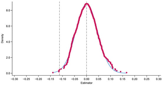 Placebo test. Red dots: The distribution of estimated coefficients from 500 placebo tests. The central vertical dashed line: The null effect. The left vertical dashed line: the actual estimated effect from the original model.