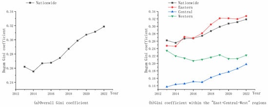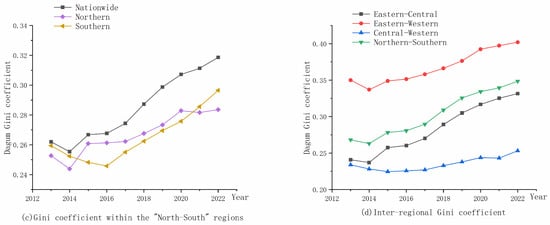 - This study utilizes the Dagum Gini coefficient and its decomposition method to thoroughly clarify the dynamics of spatial disparities and their origins in the emergence of digital villages in China. The research findings show that the growing imbalance in developing digital rural areas in our country is highlighted by the widening regional differences in the development of digital rural areas. The North–South discrepancies are mainly attributed to intra-regional variances, while the East–West differences are largely due to inter-regional disparities. Disparities are evident both intra-regional and inter-regional to differing extents.