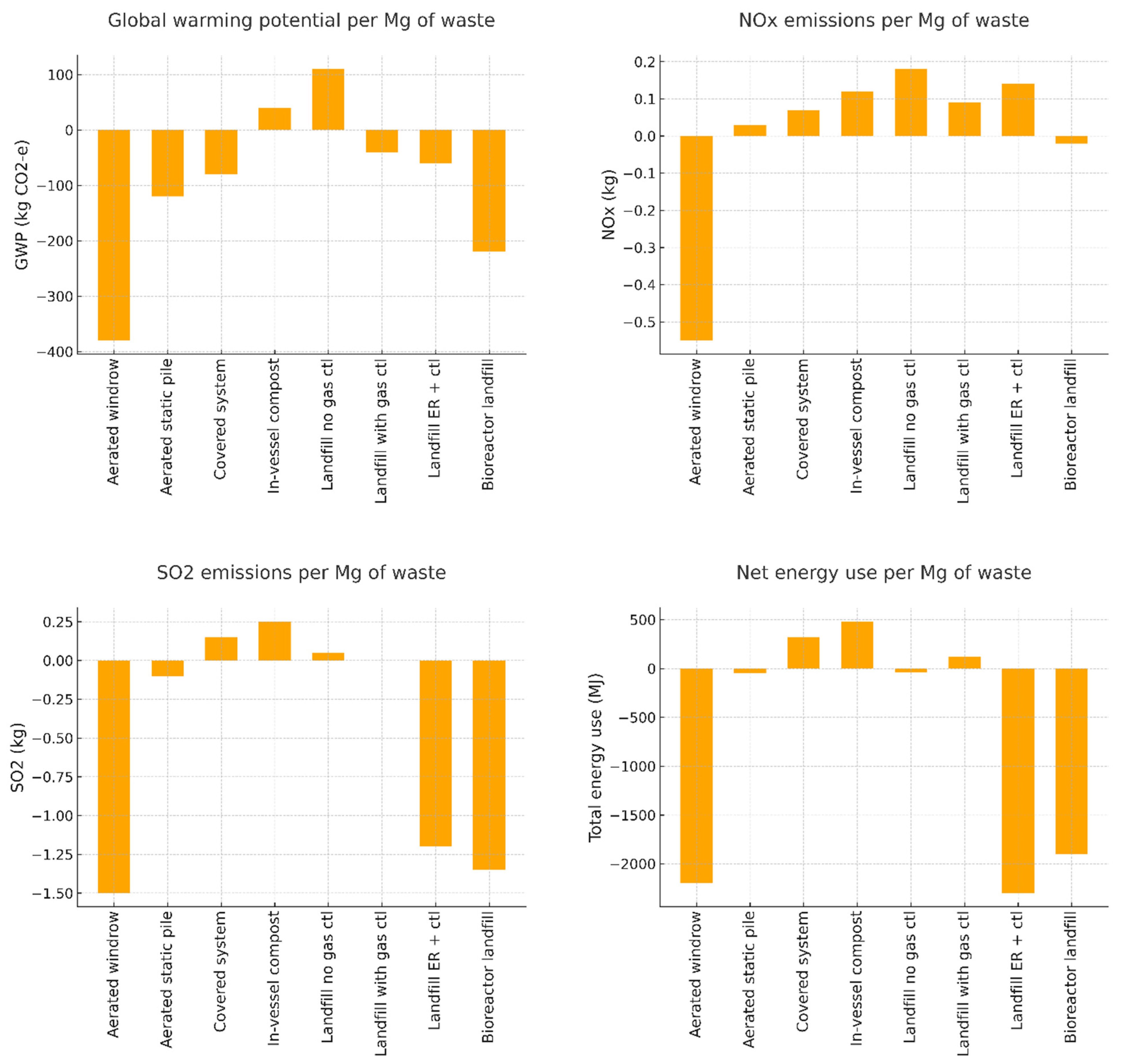 | Composting (aerated static pile) | −300 to 0 | 0 | Moderate | High | Best under organics mandates |