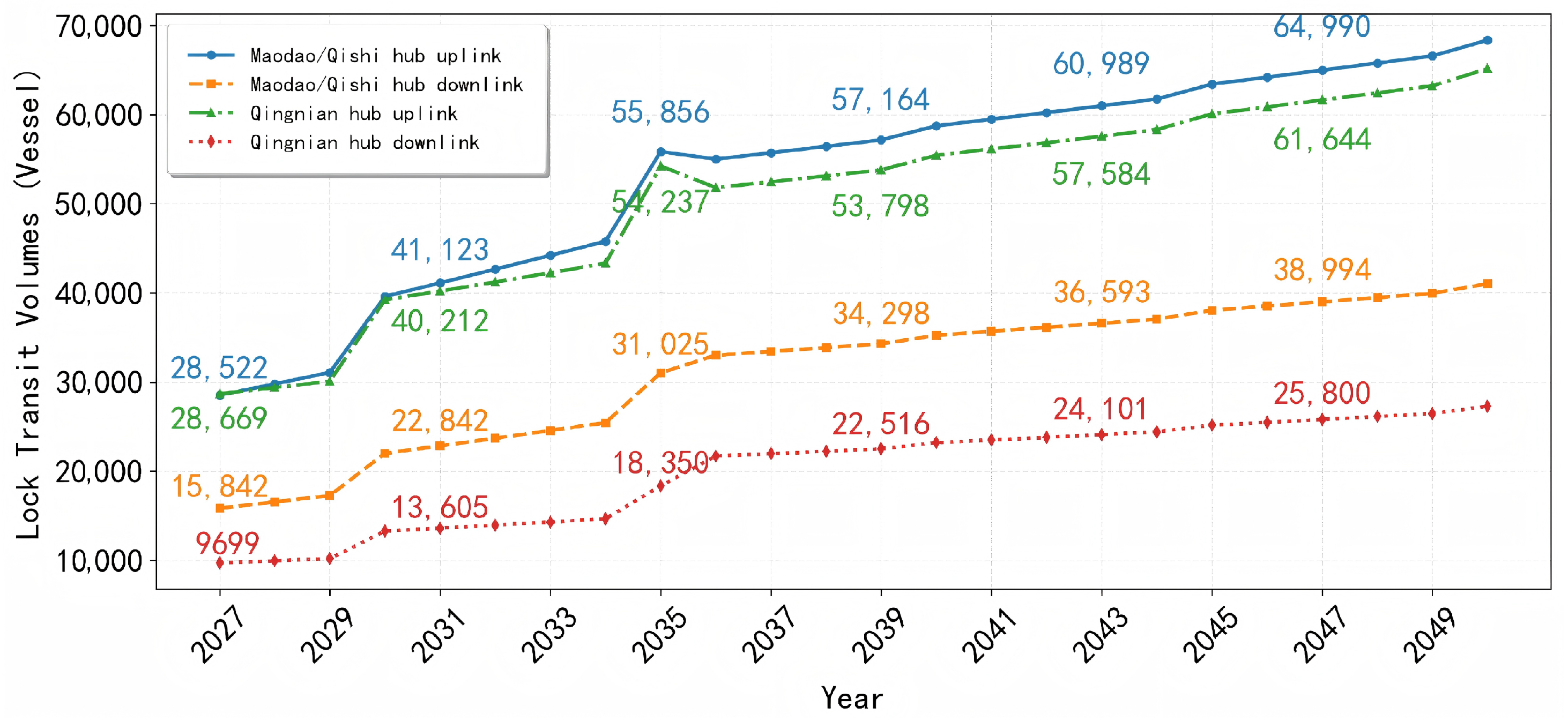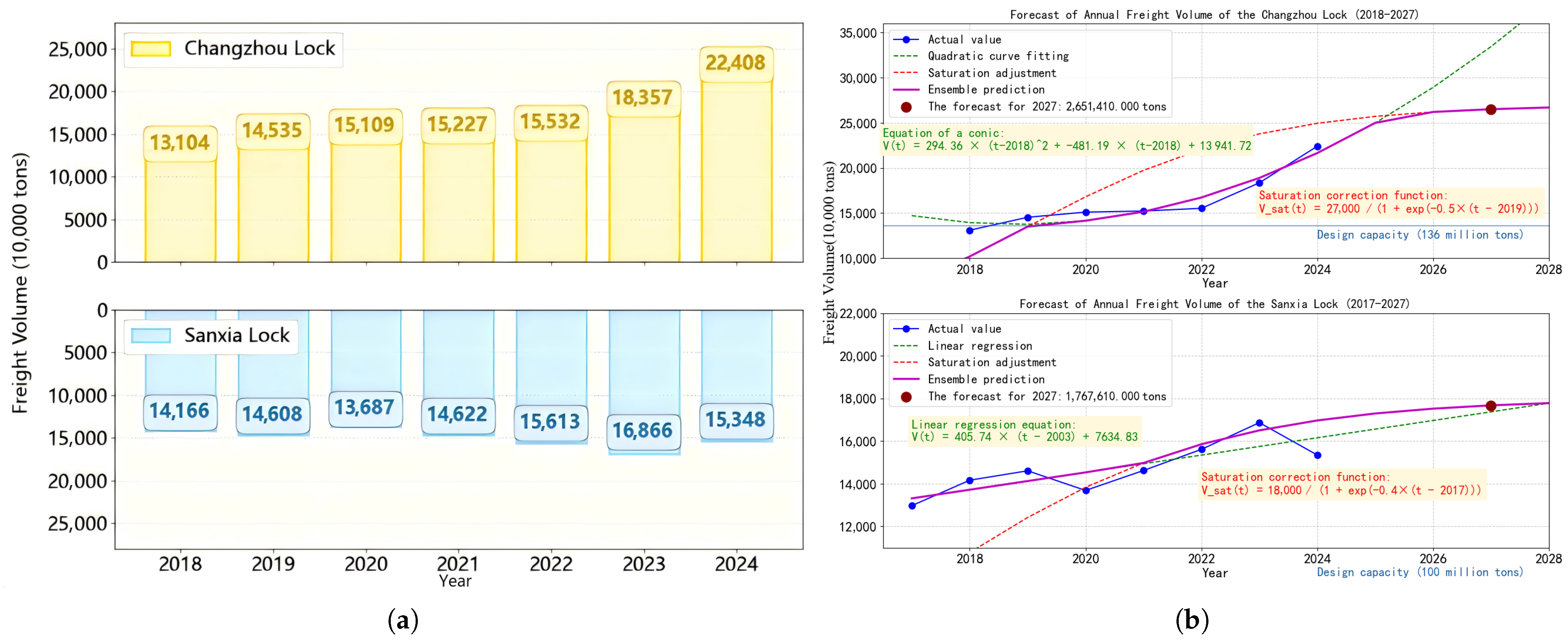 - An cascaded prediction chain of “cargo volume–transit volume–electricity consumption” is established: First, the cargo volume for the target canal is predicted by integrating the logistic saturation correction method and the comprehensive transportation sharing method. Then, a tonnage-ship number dynamic mapping model is developed to convert cargo volumes into transit volumes based on the trend of ship gigantization. Finally, a ship lock electricity consumption mechanism-data hybrid model and a three-layer “Node–Behavior–Energy” (NBE) prediction framework for shore power are constructed based on the core variables of transit volumes to collaboratively predict the electricity consumption across the entire process.