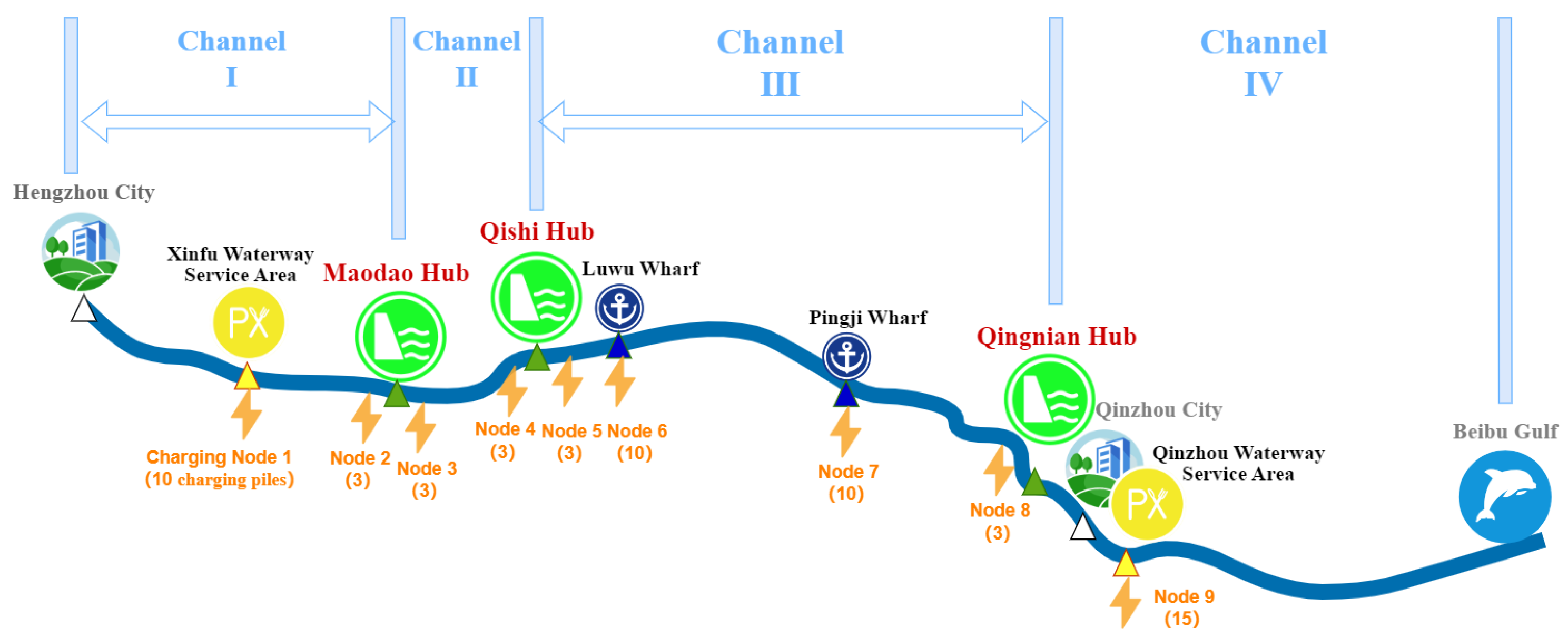 - Lin, J.Y.; Cheng, L.; Lin, Y.; Wu, S.J.; Sun, C.P.; Gao, N. Planning Method for Charging Stations in Inland Ports Serving All-Electric Vessels. J. Shanghai Marit. Univ. 2025, 46, 44–51. [Google Scholar]