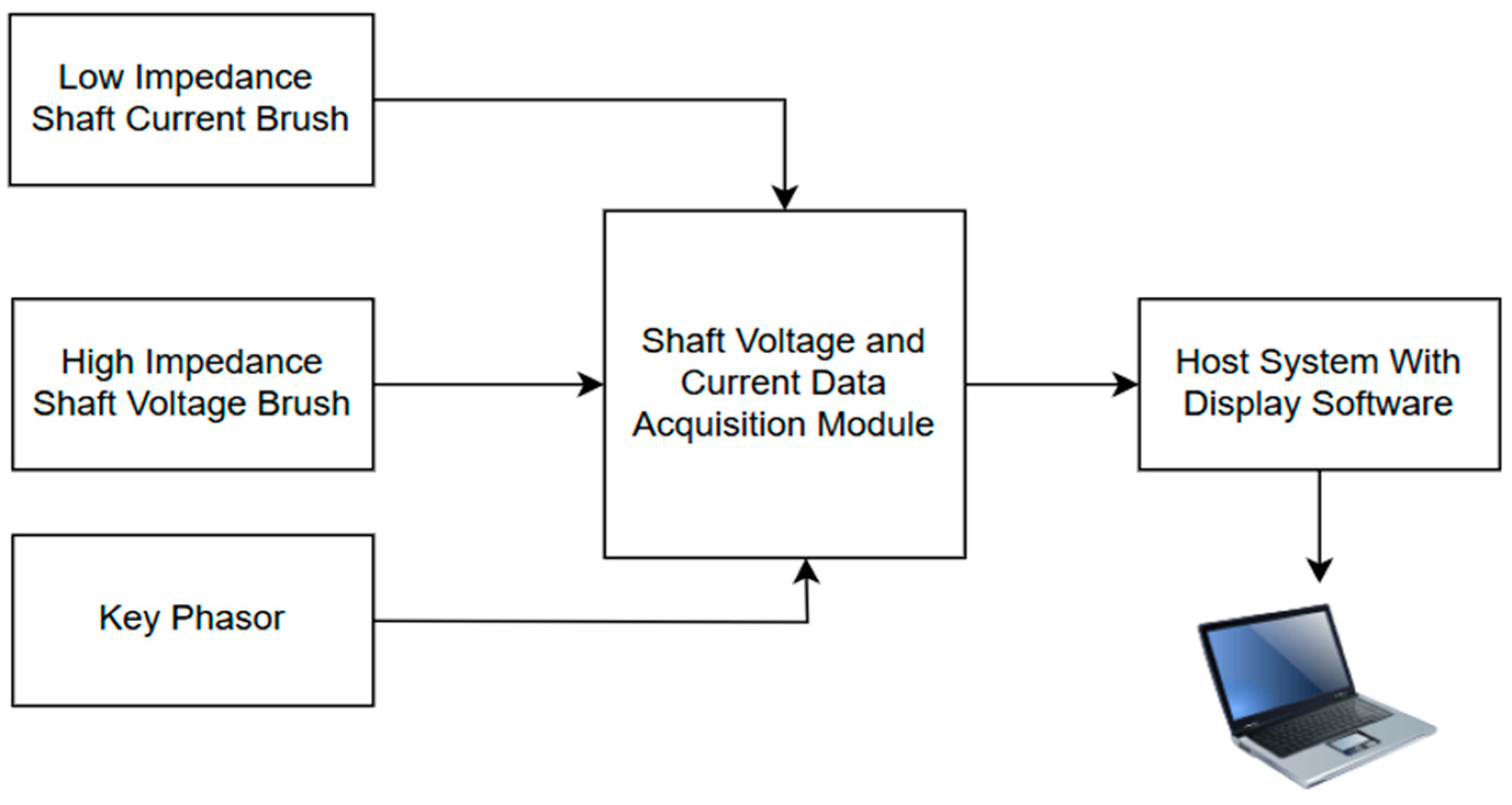 Figure 1. It employs three synchronized input channels: a high-impedance voltage brush, a low-impedance current brush, and a key-phasor signal providing a once-per-revolution reference.