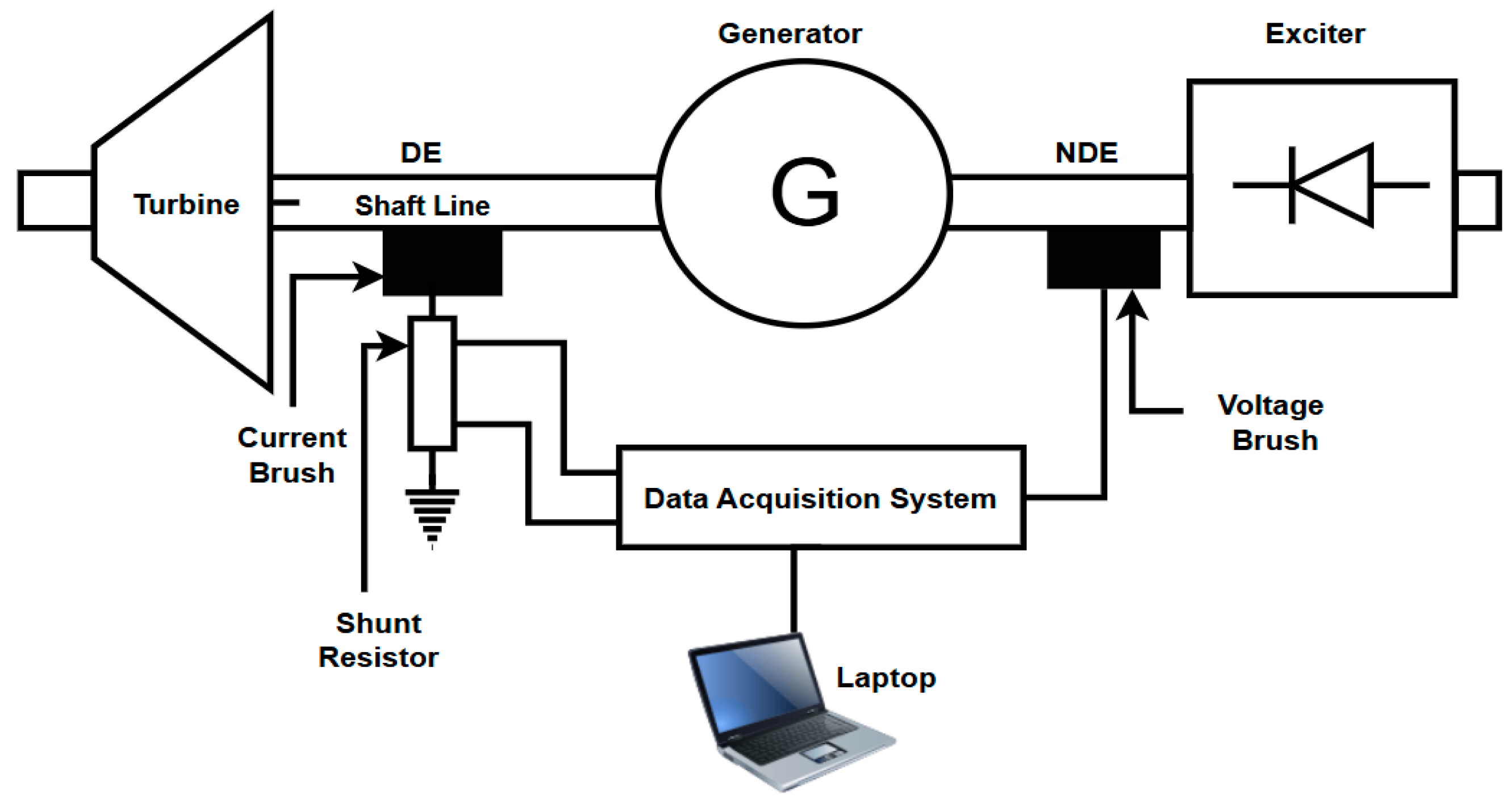 Figure 2 depicts a representative generator installation with the associated measurement instrumentation system. The non-drive-end (NDE) voltage brush senses shaft potential, while the drive-end (DE) brush provides a low-impedance grounding path through a calibrated 0.0496 Ω precision shunt (150 A, 1100 W). The voltage across the shunt yields the shaft current measurement. This configuration complies with IEEE 112 test method guidelines [