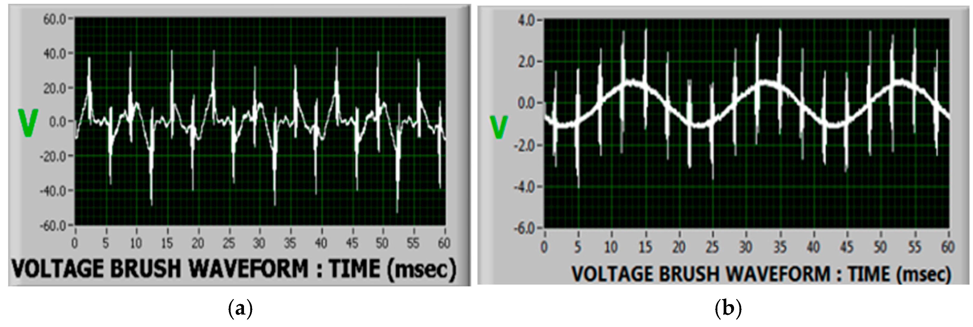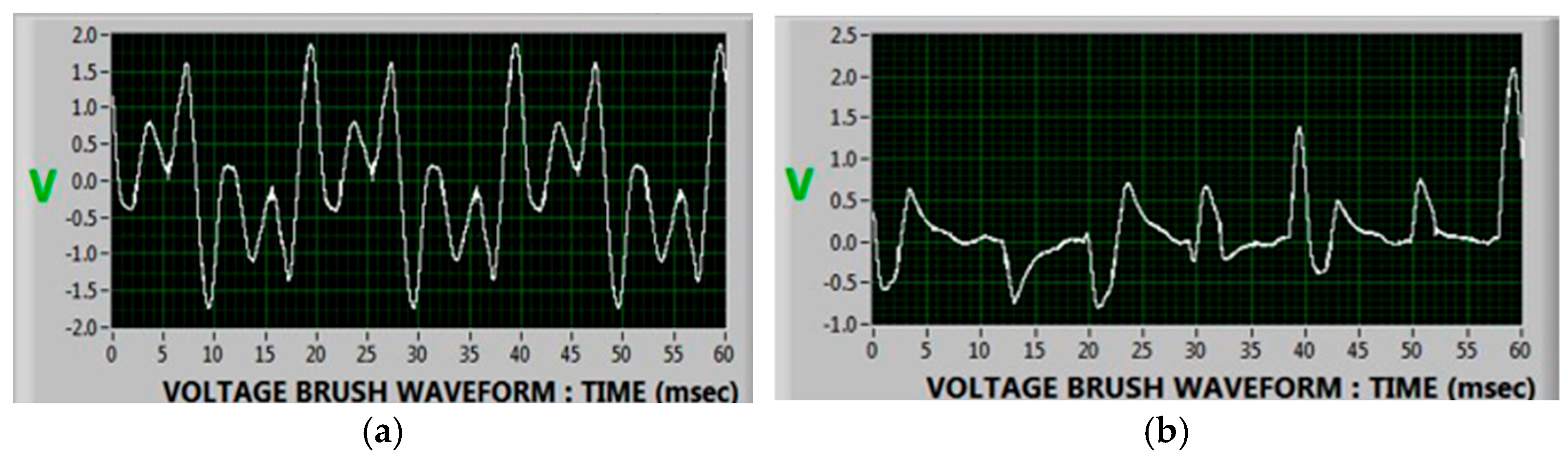 Power Station A shaft voltage brush waveform (V): (a) baseline vs. (b) floating voltage brush. Source: Authors.