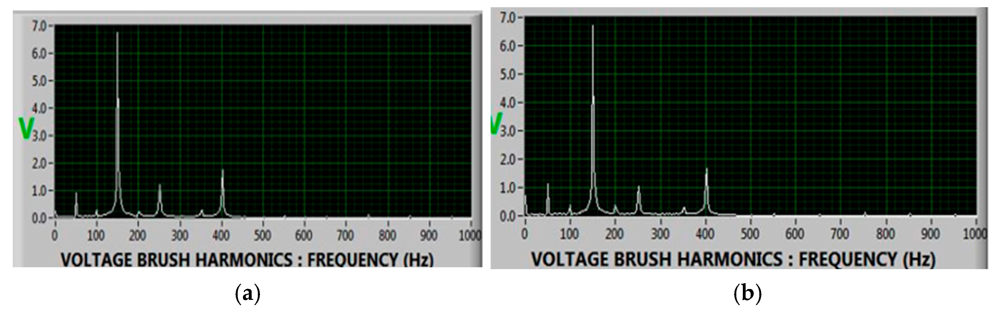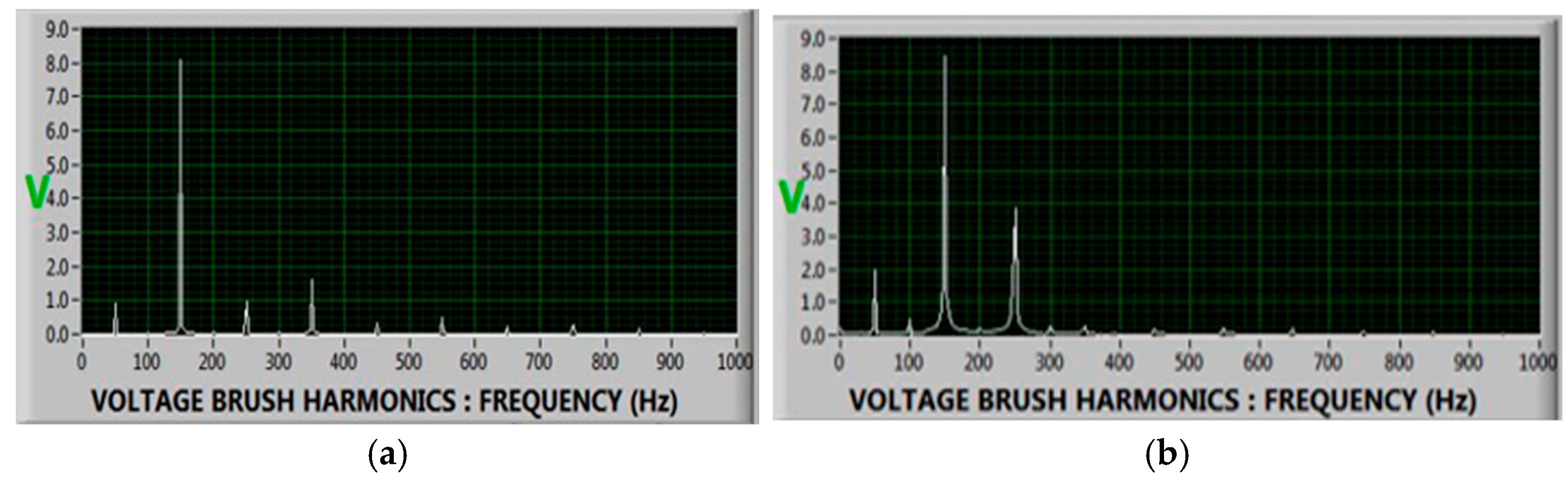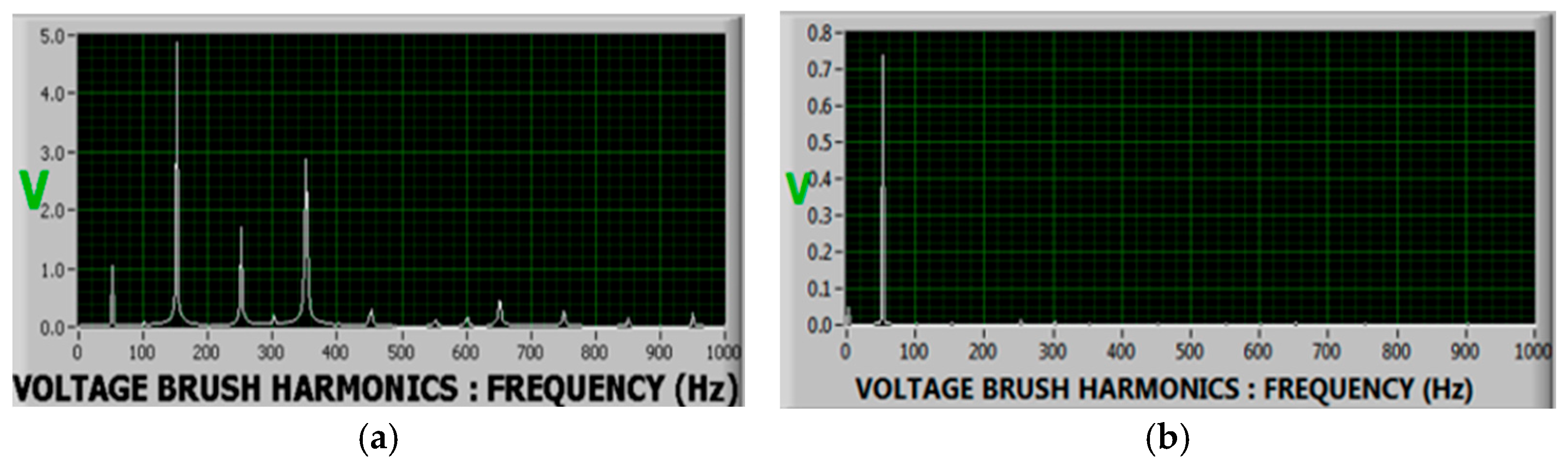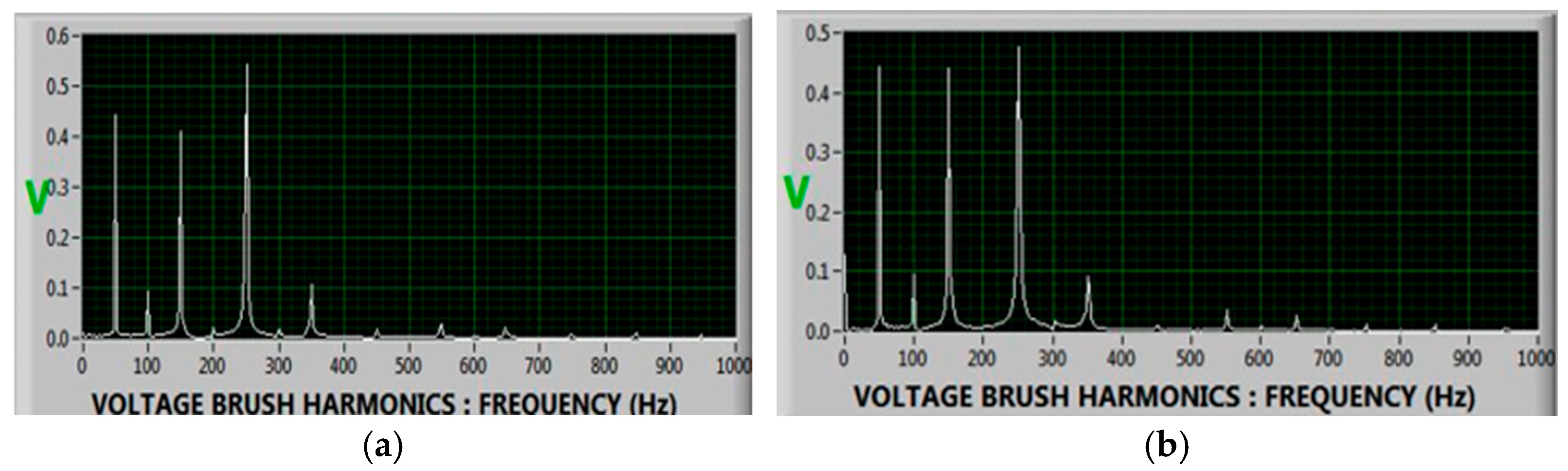 Table 2 provides numerical harmonic indices for the second, third, fifth, and seventh shaft voltage harmonics under both baseline and fault conditions for all four case studies. These harmonic indices were derived by visually ranking the relative magnitudes of the FFT components within each spectrum, using a normalized scale (0–5) due to the absence of absolute Y-axis values in the exported DAQ figures. Although the plotted FFT images do not preserve numeric vertical scaling, the relative changes in harmonic strength remain diagnostically meaningful.