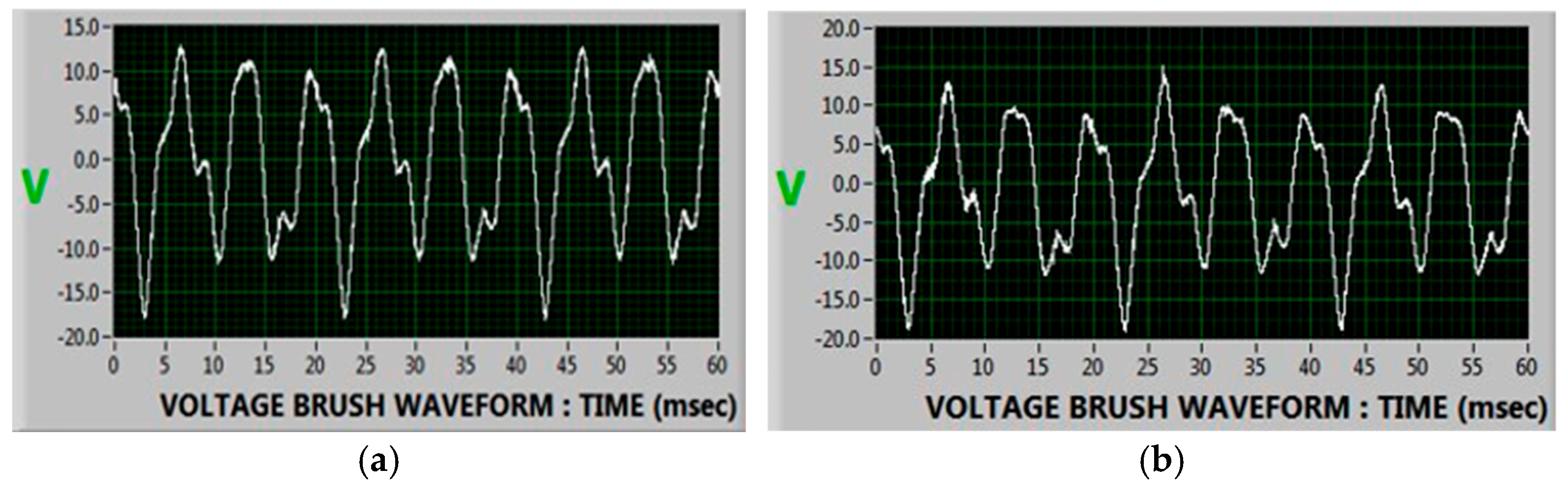 The proposed thresholds for RMS reduction (>30–40%) and DC offset elevation (>0.1–0.2 V) are derived from empirical observation across four operational case studies rather than from a formal statistical population analysis. Healthy machines consistently exhibited stable RMS values (typically varying only ±5–10%) and negligible DC offset (<0.05 V), whereas all documented fault conditions produced substantially larger deviations. Floating-brush and worn-brush faults resulted in RMS reductions exceeding 30–40%, while floating-current-brush and contamination faults introduced DC offsets above 0.1–0.2 V. These thresholds therefore reflect robust, repeatable field signatures that align with the underlying physical mechanisms of intermittent conduction, asymmetric discharge, and semi-conductive film rectification.