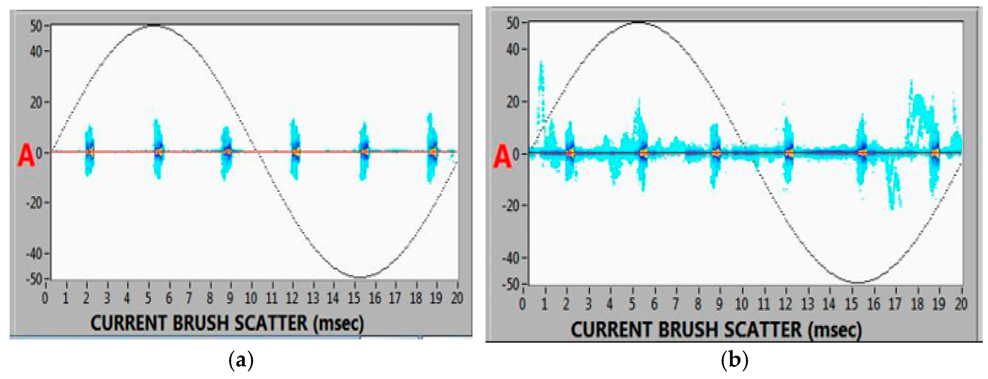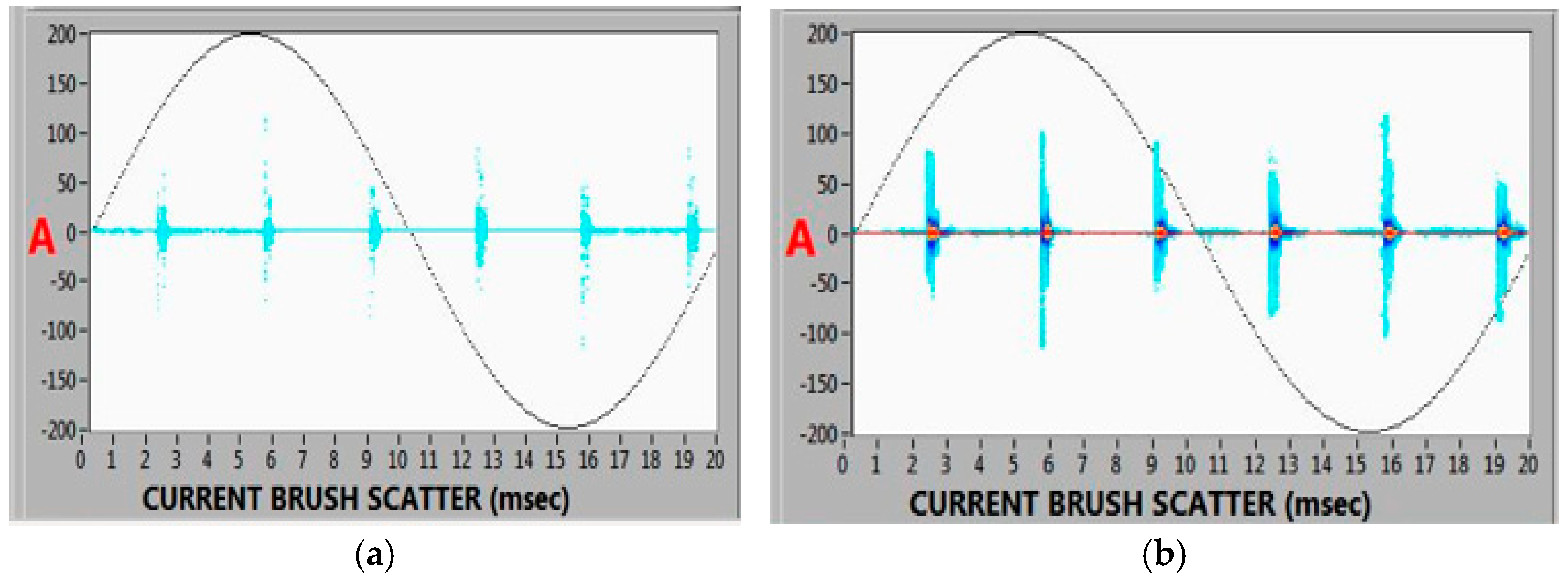 Figure 10 presents scatter plots of shaft currents for baseline vs. fault conditions. With one voltage brush floating, the average shaft current found alternate paths (likely through the remaining grounding brush or even through bearings). The fault condition showed significantly higher and more erratic current values. The peak current rose from high resolution ones 0.39 A to 6.60 A, and the RMS current rose from 0.30 A to 2.31 A (