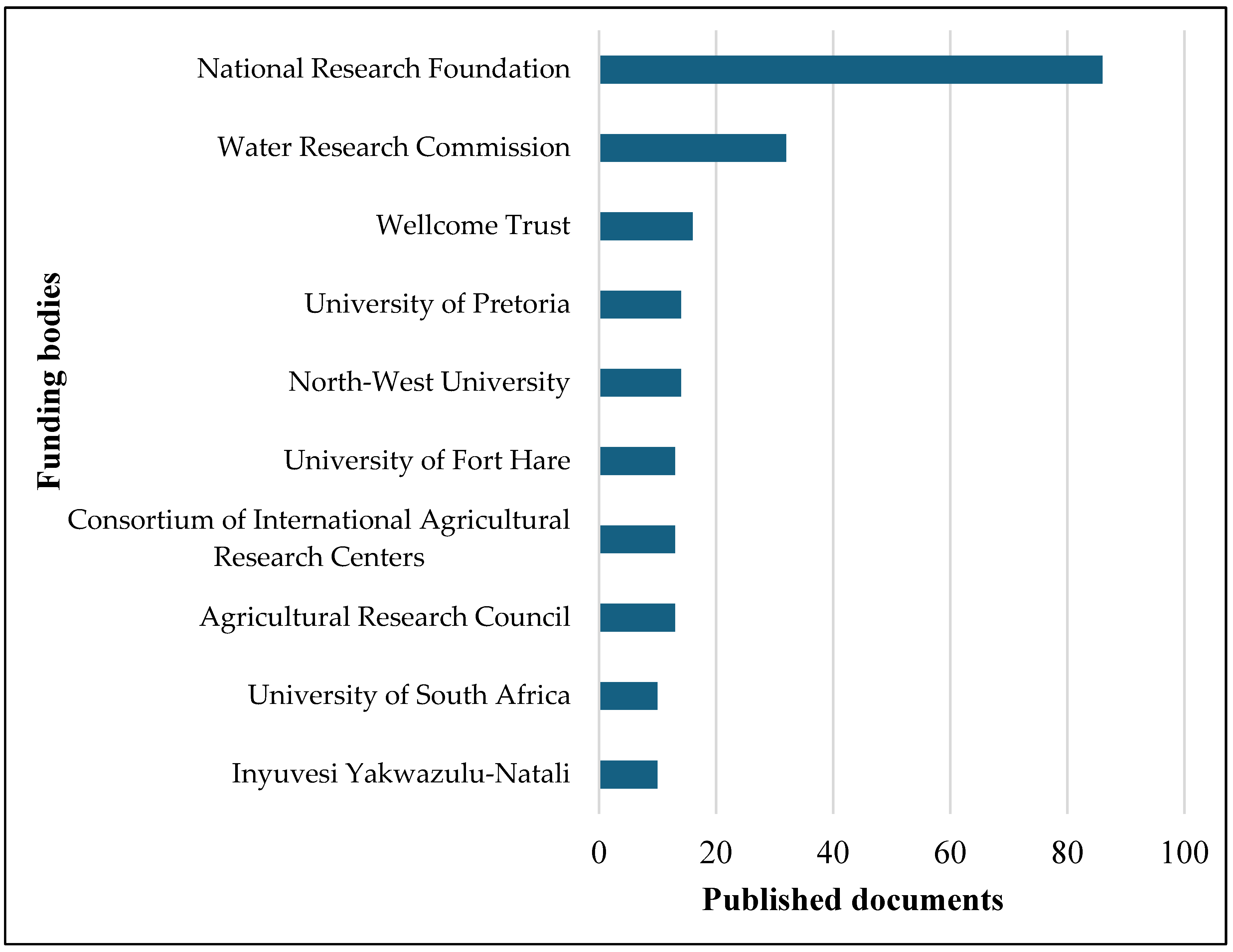 - Mantlana, B.; Nondlazi, B.X.; Naidoo, S.; Ramoelo, A. Insights on Who Funds Climate Change Adaptation Research in South Africa. Sustainability 2025, 17, 1993. [Google Scholar] [CrossRef]